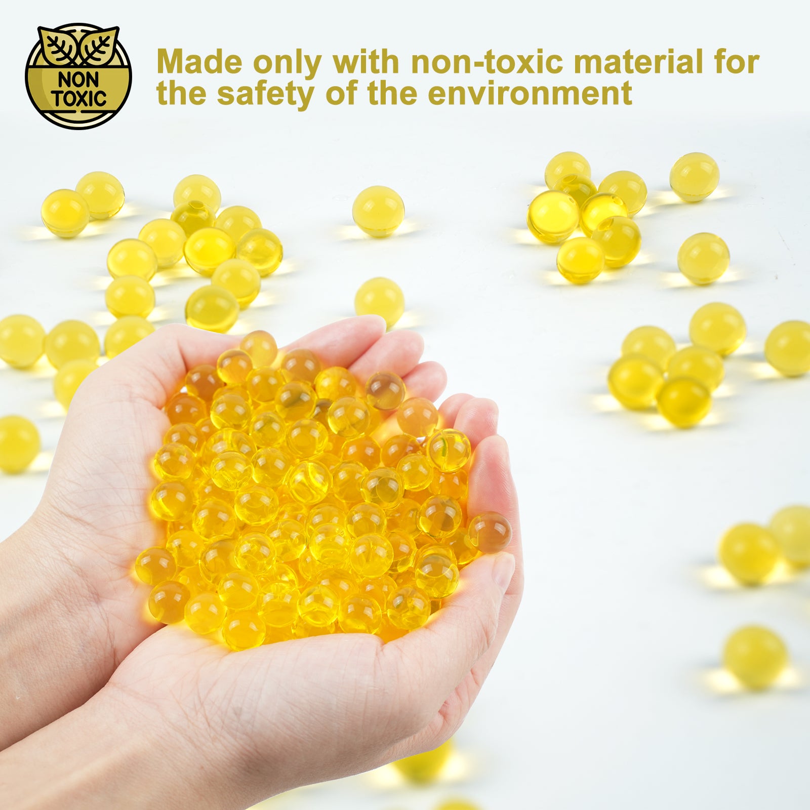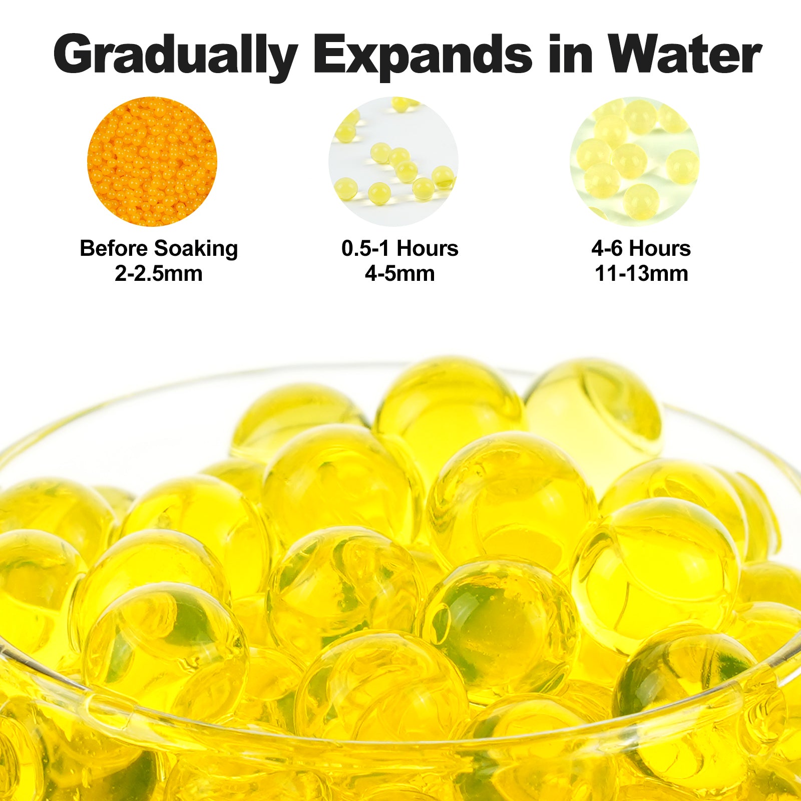 1、Packing: Include 300,000 pcs Yellow water beads. Compared with other brands, our gel jelly beads won’t be broken apart easily if you bounce them too hard. They are about 1.5-2.0MM in diameter before absorbing the water. After 4 hours, the gel water pearls will grow up to 11-13MM.